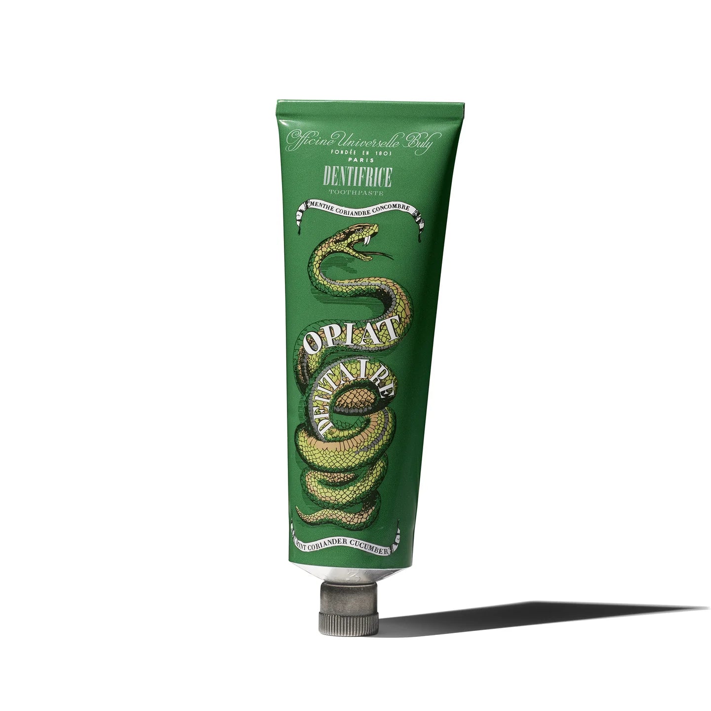 Ses couleurs vives ornés de motifs symboliques évoquent à la perfection le serpent vert fascinant du tube de l’Opiat Dentaire de l’Officine.
