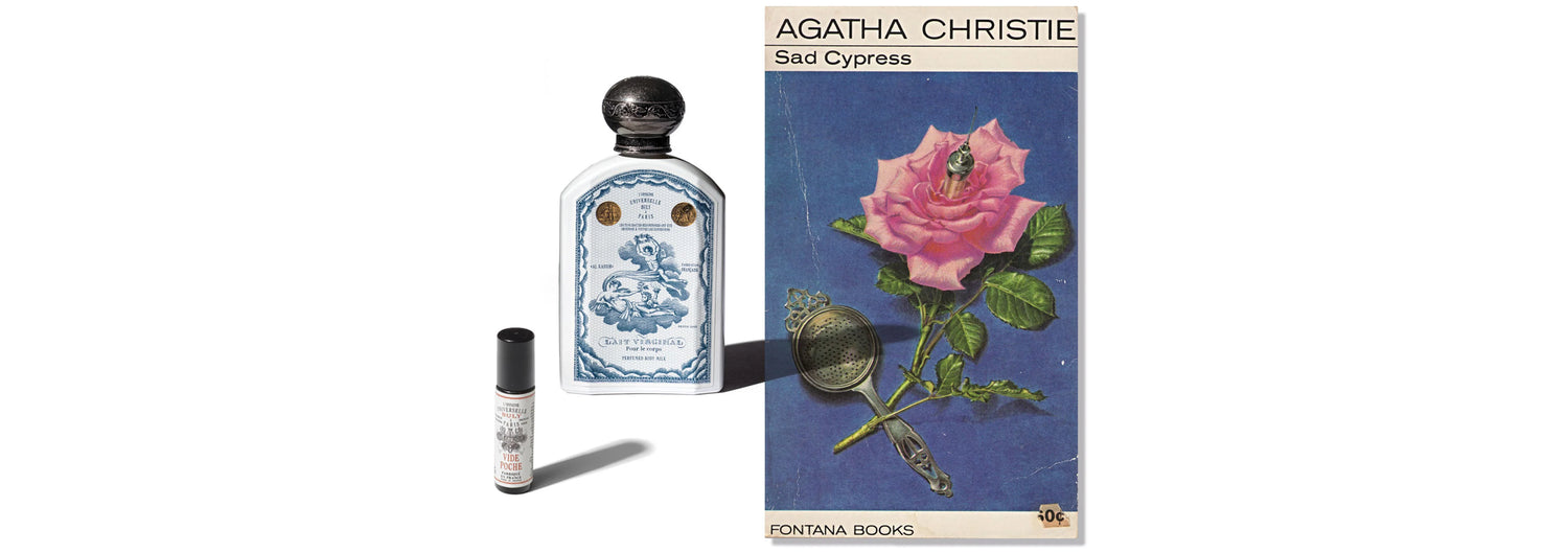 Jardinière émérite, Agatha Christie a écrit un poème en hommage à cet univers My Flower Garden et a même hissé la rose au rang d'indice majeur dans un de ses romans Je ne suis pas coupable où un de ses témoins affirme avoir été blessé par l’épine d’un rosier parfumé... sans épines, le Zéphirine Drouhin. On préférera à cette fleur la Rose de Damas, une senteur déclinée comme un bouquet en Huile de savon, Huile Antique, Lait Virginal ou Eau Triple. Le parfum lui-même fait partie des traces laissées par les criminels et Poirot, dont l’odorat est très fin, va déceler les envoûtantes émanations d’un parfum fictif « Gabrielle 16 » sur les lieux du crime dans Les Vacances d’Hercule Poirot en 1941.
