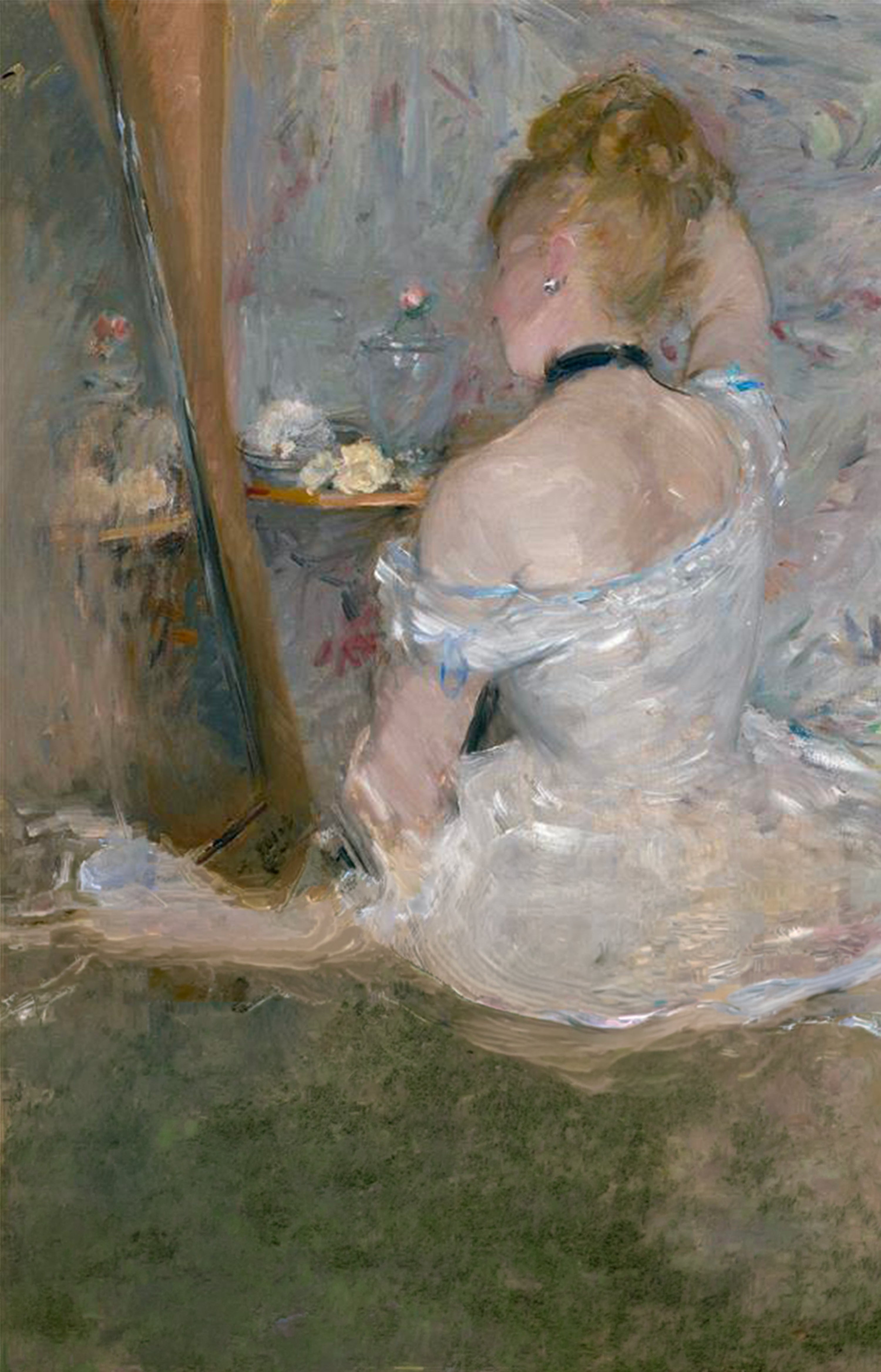 7:45 — L’étude attentive de soi au miroir, fidèle compagnon à l’œil sévère mais au conseil amical. Suzanne le redoute parfois, les lendemains d’une courte nuit où les traits du visage et les entrailles sont comme désobligés. Mais, elle sait aussi en apprécier les échos. Cette ambivalence face à elle-même est fondamentalement l’un de ses plus grands charmes. En ce jour, Suzanne semble satisfaite de son reflet et s’autorise un discret rictus empreint de pudeur. Ce n’est qu’après avoir miré son minois que la valse des soins débute et ses mains se mettent alors à l’ouvrage.