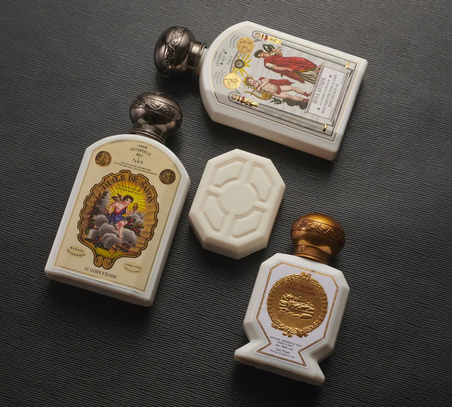 Upon request, your purchases are wrapped in a printed paper reproducing an old newspaper or slipped into an elegant, green-marbled gift pochette, as an homage to the creation and history of the Officine Universelle Buly.