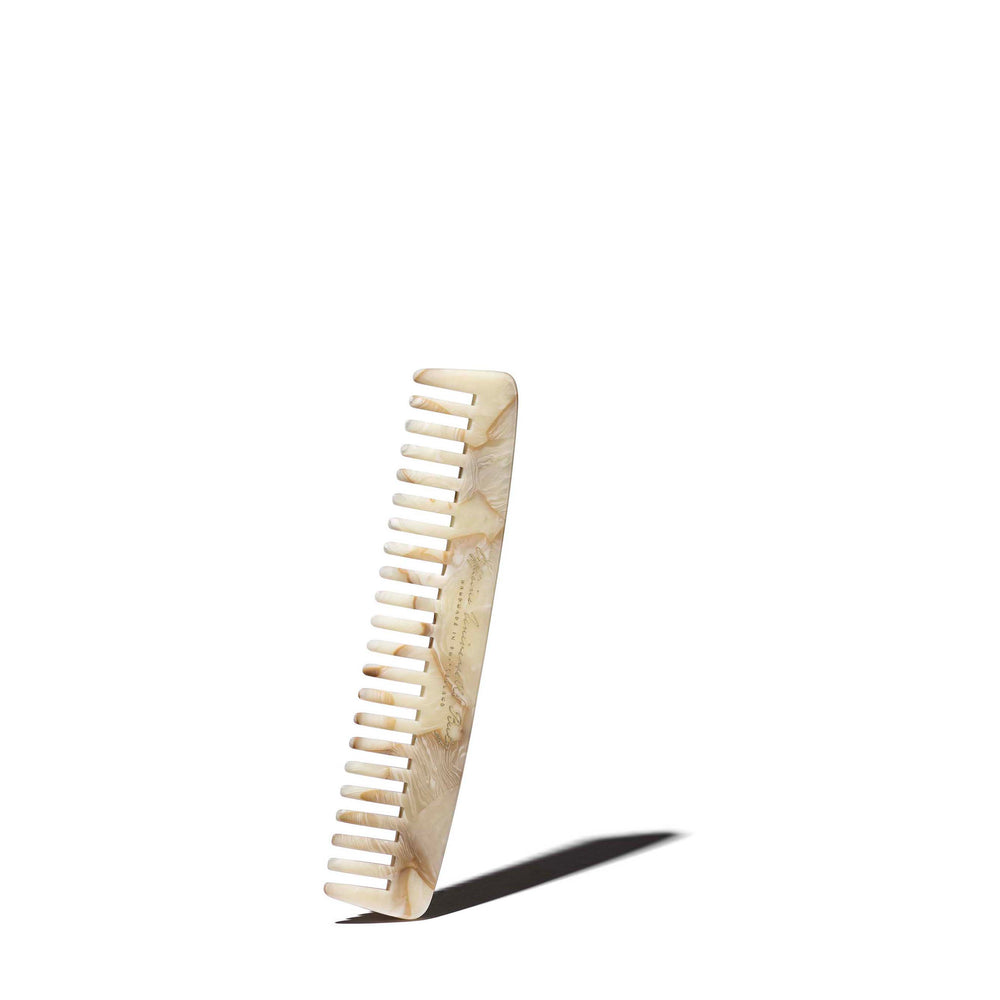 This comb is handcrafted in Switzerland by one of the last manufacturers in Europe. Cut from a block of very high quality acetate, it is shaped, sculpted and then polished. The teeth and notches are especially arranged so as not to injure the hair. A plant fibre, the acetate reveals a unique pattern specific to each comb.