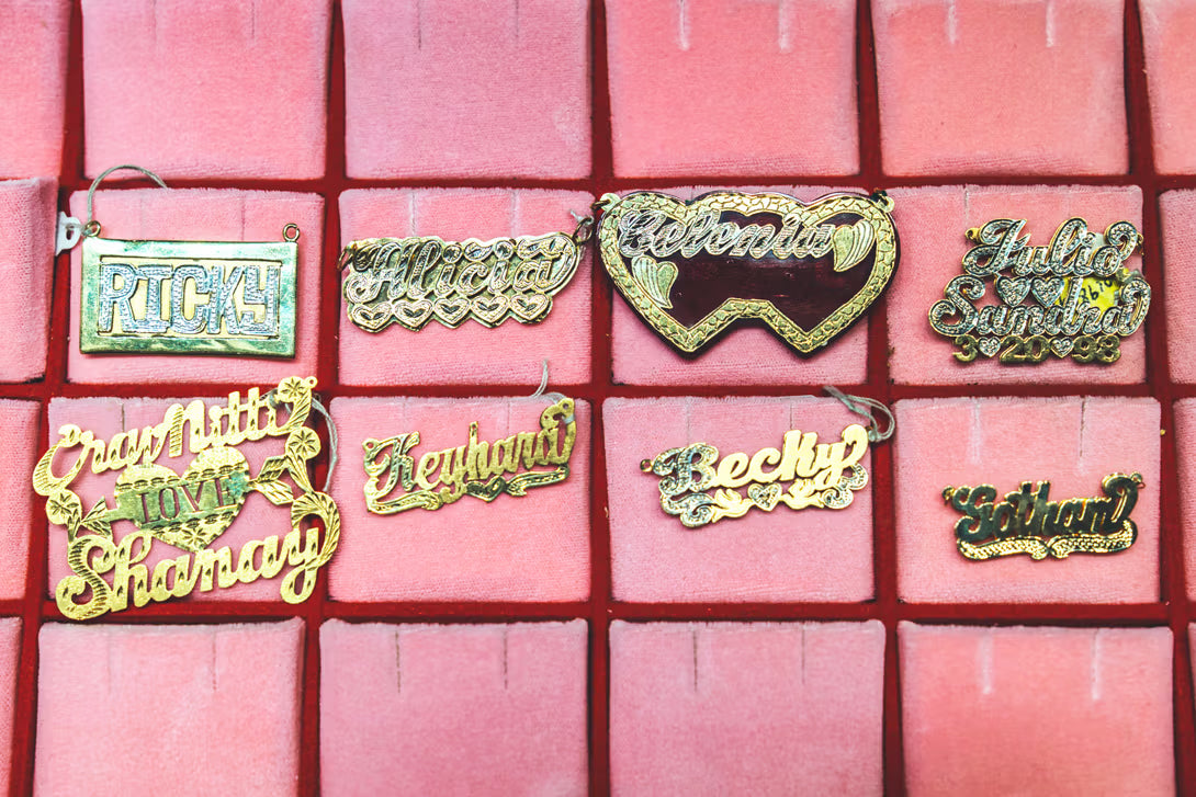 In post-war United States, among African-American and Latino communities living in urban areas, a trend emerged, that of wearing jewellery bearing one’s surname, first name or nickname as a way of asserting identity, group affiliation and symbolic and cultural heritage. These precious metal plates in gold or silver are given as birth gifts and then at every significant moment in life, and are duly collected. More than just a piece of jewellery, it is a powerful social and political act: a name that is not Westernised is transformed into gold and proudly displayed. In his 1989 film Do the Right Thing, Spike Lee reinterprets the “Love/Hate” tattooed on Robert Mitchum’s hands in The Night of the Hunter into gigantic “nameplate” rings.