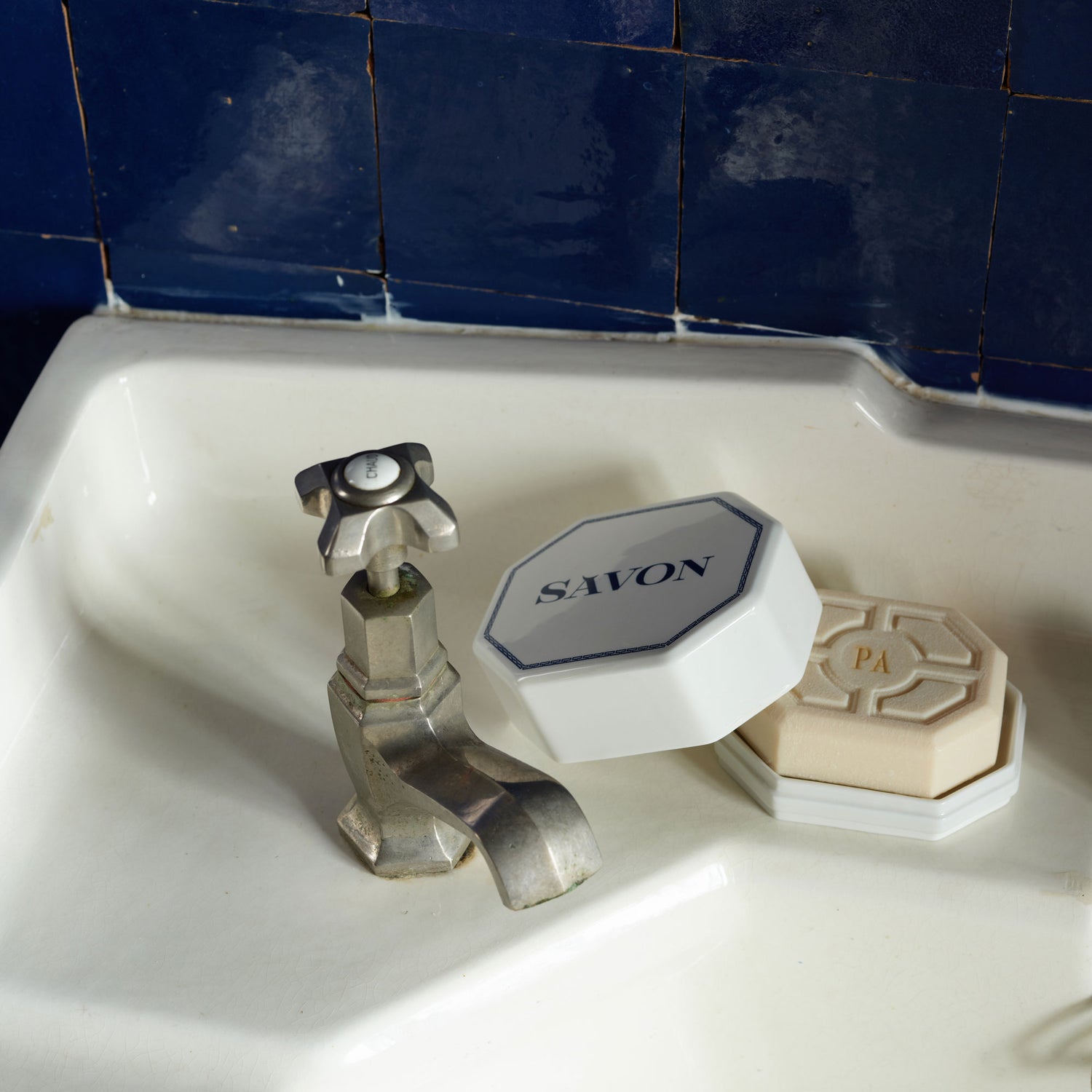 Made from glazed porcelain, the Soap Holder of The Officine is the ideal home for any Savon Superfin. Its octagonal shape is a perfect match for its soap twin, and its immaculate colour is a perfect echo of bathroom tiles. Made up of two interlocking parts - a cover and a drip tray - it sits gracefully on the edge of a bathtub or basin, tenderly tending to the Savon Superfin by giving it a moment’s respite. This way, the soap preserves its shape, its virtues and its fragrance wash after wash.