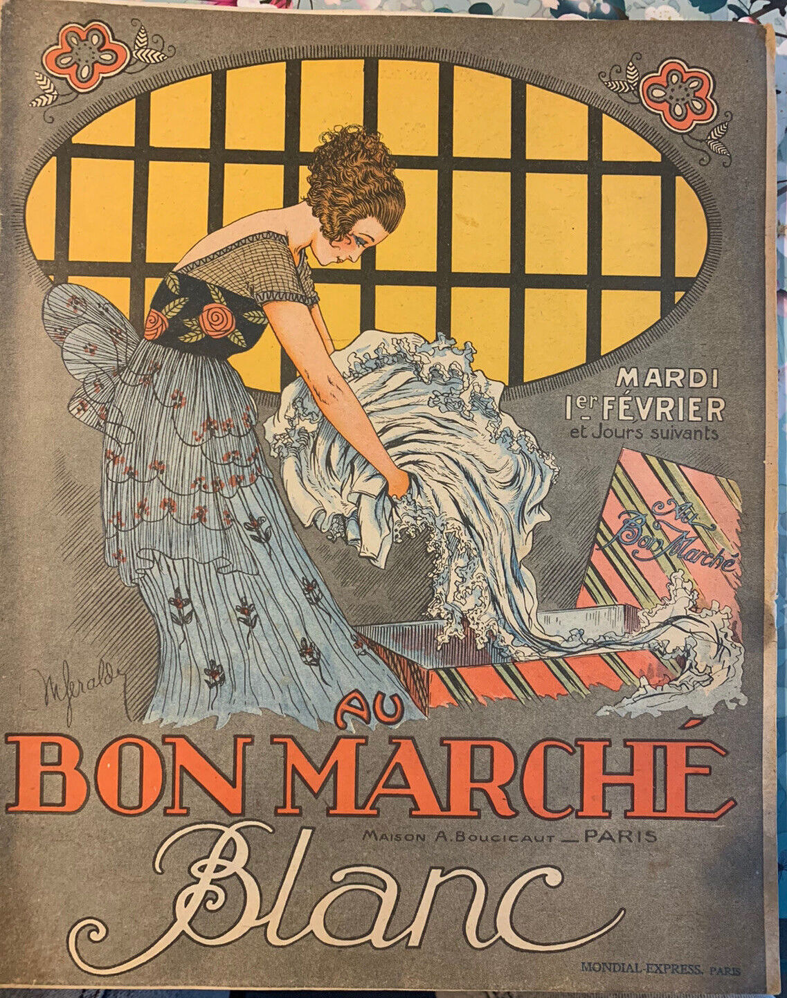 Inauguré en 1838 par les frères Videau puis emmené vers un succès intersidéral par les intuitions d’Aristide Boucicaut, Le Bon Marché révolutionne le marché du luxe et de la mode, et intronise le long règne des grands magasins où le « client est roi ». Boucicaut voit grand et ouvre en 1871 un service de vente par correspondance qui compte deux départements, un pour la France et le second, pour l'international. Le succès est fulgurant : en 1894, Le Bon Marché distribue 1 500 000 catalogues. Au début du XXe siècle, le catalogue prend des couleurs, des artistes d’excellence sont engagés pour l’illustrer. Les catalogues des grands magasins deviennent un miroir glamour de la mode de l’époque. À ce jeu-là, les Français et les Américains sont les premiers sur le podium.