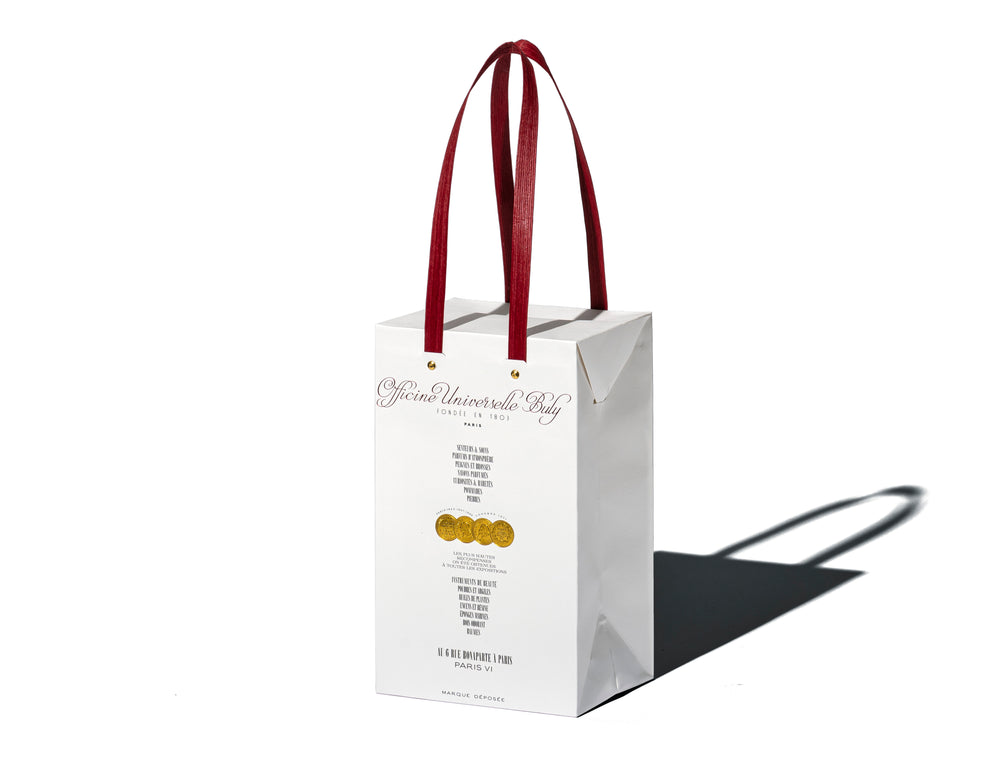 Le sac de l’Officine Universelle Buly combine avec audace le côté délicat et festif d’un paquet cadeau immaculé aux pliures impeccables et l’efficacité d’un shopping bag frappé de nos quatre médailles.