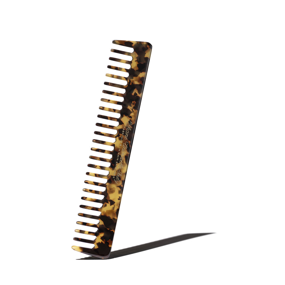 Ce peigne est fabriqué à la main en Suisse par l’un des derniers fabricants d'Europe. Taillé dans un bloc d’acétate de très haute qualité, il est façonné, sculpté et poli. Les dents et les entailles sont spécialement agencées pour ne pas blesser les cheveux. L’acétate, fibre végétale, révèle un motif unique, propre à chaque peigne.